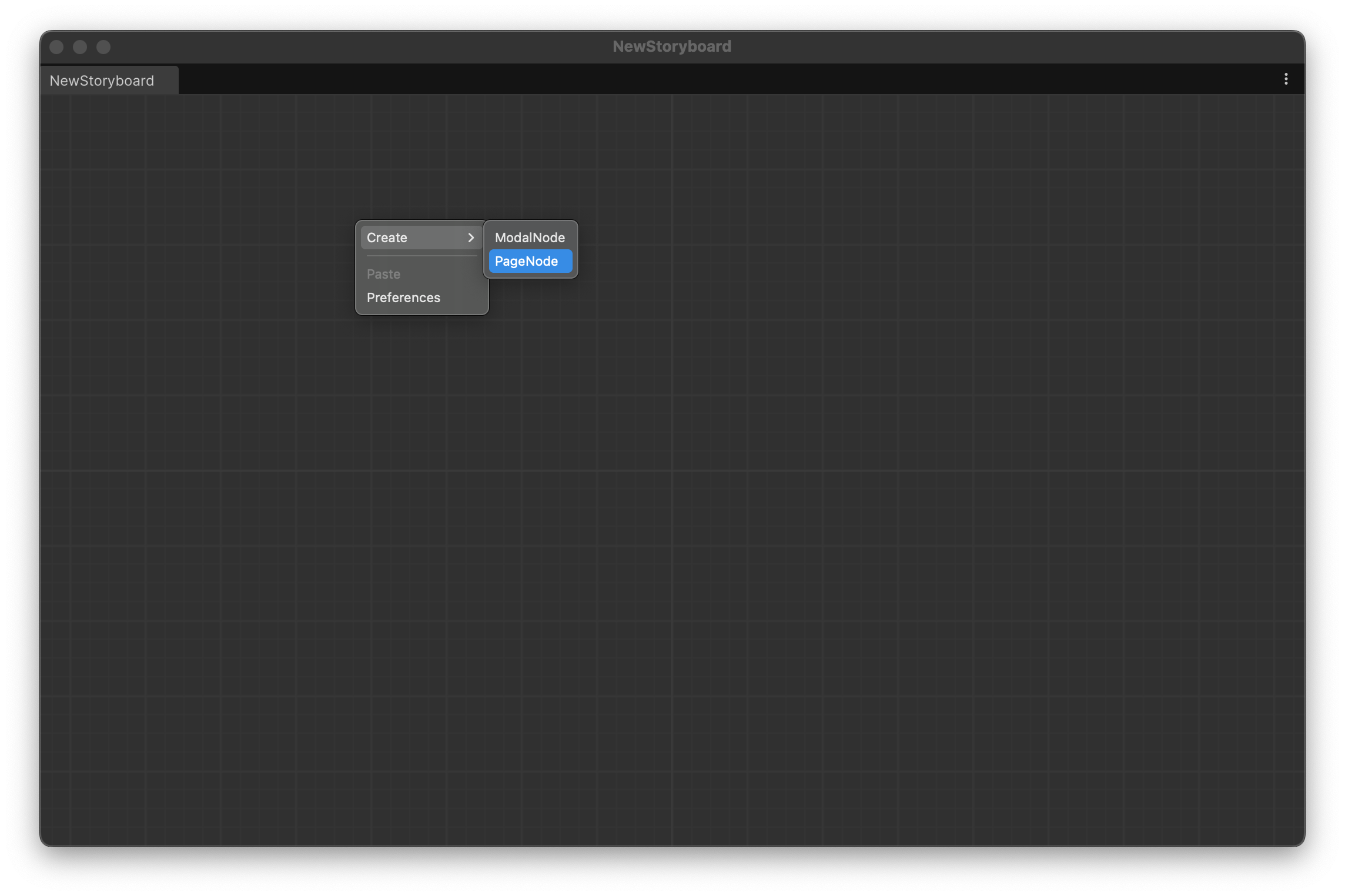 1. In a blank space on your storyboard, create a `우클릭` ->> `Create` ->to a blank space on the storyboard. `PageNode`